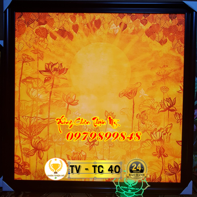 Chất liệu : khung composite vân gôc không cong vênh và bay màu theo thời gian , in trên chất liệu film dẫn sáng nhập khẩu từ hàn Quốc , Bề mặt phủ một lớp ánh kim , khi tắt điện ánh kim lấp lánh rất sang trọng