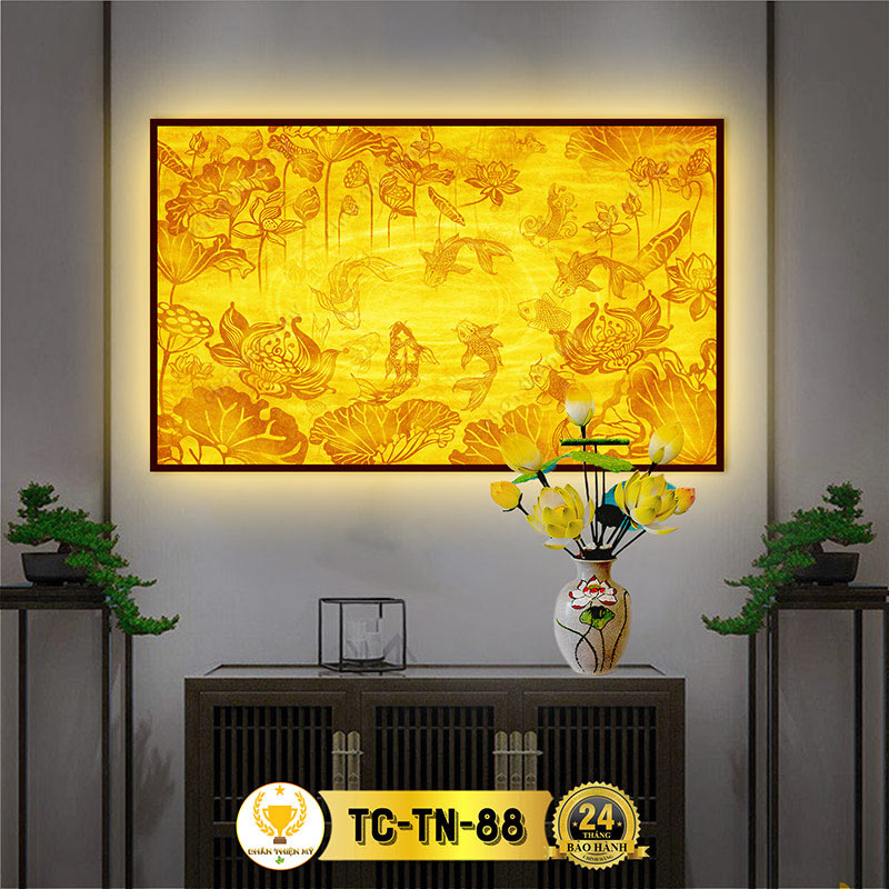 - Bề mặt tranh: Được in bằng công nghệ Nhật Bản trên tấm film dẫn sáng của Hàn Quốc tạo nên ánh sáng chan hòa đều khắp mặt tranh. Bề mặt tranh được phủ thêm một lớp ánh kim 5D chống bay màu, không bám bẩn, khi không bật đèn kim sa lấp lánh, tạo nên sự sang trọng và đẳng cấp cho sản phẩm.