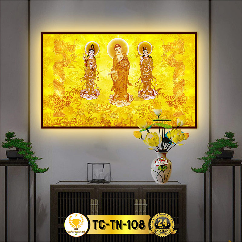 Hào Quang Phật Tây Phương Tam Thánh In Tranh Trúc Chỉ Ngang CHÂN THIỆN MỸ, Trang Trí Bàn Thờ, Treo Phòng Thờ TC-TN-108