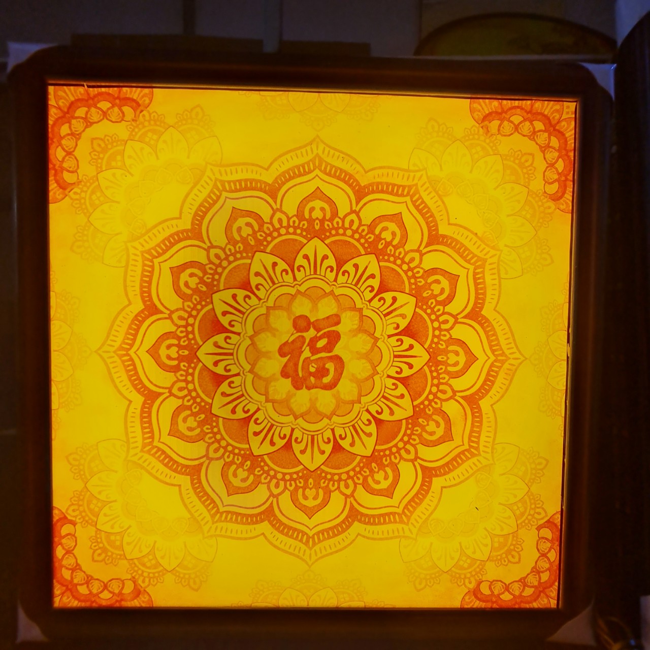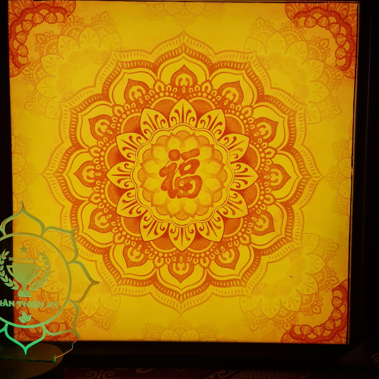 Chất liệu : khung composite vân gôc không cong vênh và bay màu theo thời gian , in trên chất liệu film dẫn sáng nhập khẩu từ hàn Quốc , Bề mặt phủ một lớp ánh kim , khi tắt điện ánh kim lấp lánh rất sang trọng